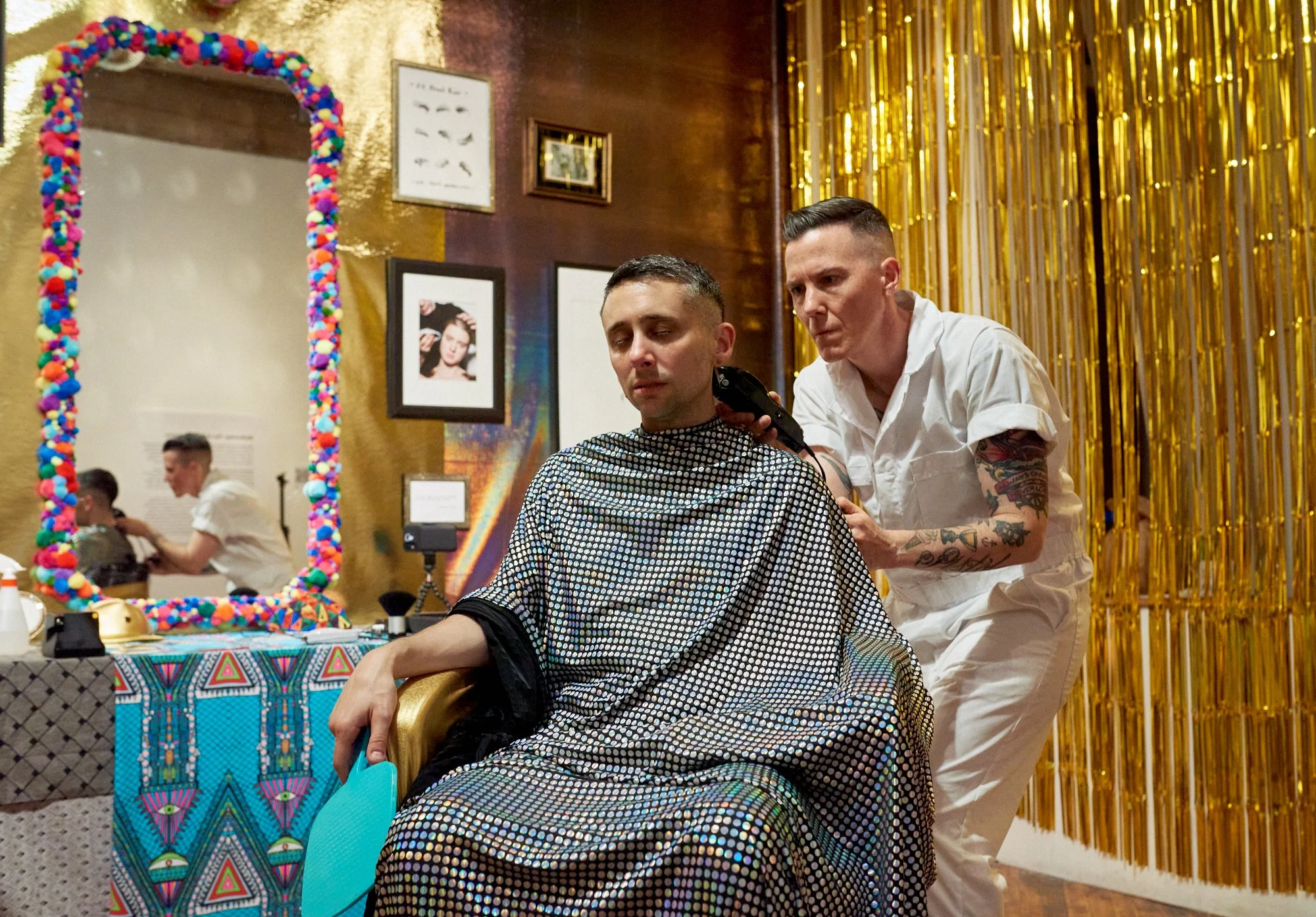 Barbershop: The Art of Queer Failure is an installation and social practice performance piece that takes the motif of the barbershop and queers it, creating a space for queer world-making. Barbershop: The Art of Queer Failure embraces the ethos of queer failure (a concept developed by queer theorist Jack Halberstam in a book by the same name) as a productive way of proposing alternatives rather than adhering to barbershop norms which under the guise of giving haircuts often reinforce notions about heteropatriarchal masculinity. Haircuts are given first come-first served, by the artist, Ace Lehner, who is not a trained barber but who has been cutting hair outside of sanctioned barber channels for over two decades; hence part of the ethos of queer failure. In exchange for a haircut, participants agree to engage in an act of queer world-making before their haircut grows out. The act associated with the haircut is negotiated during one’s haircut.